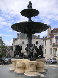 Cette fontaine représente trois lionnes ailées avec au sommet un enfant assis sur un poisson. Les deux vasques formant le motif central, données par Madame Bourdaloue, proviennent des hauts-fourneaux de Messieurs Desforges et Festugières.